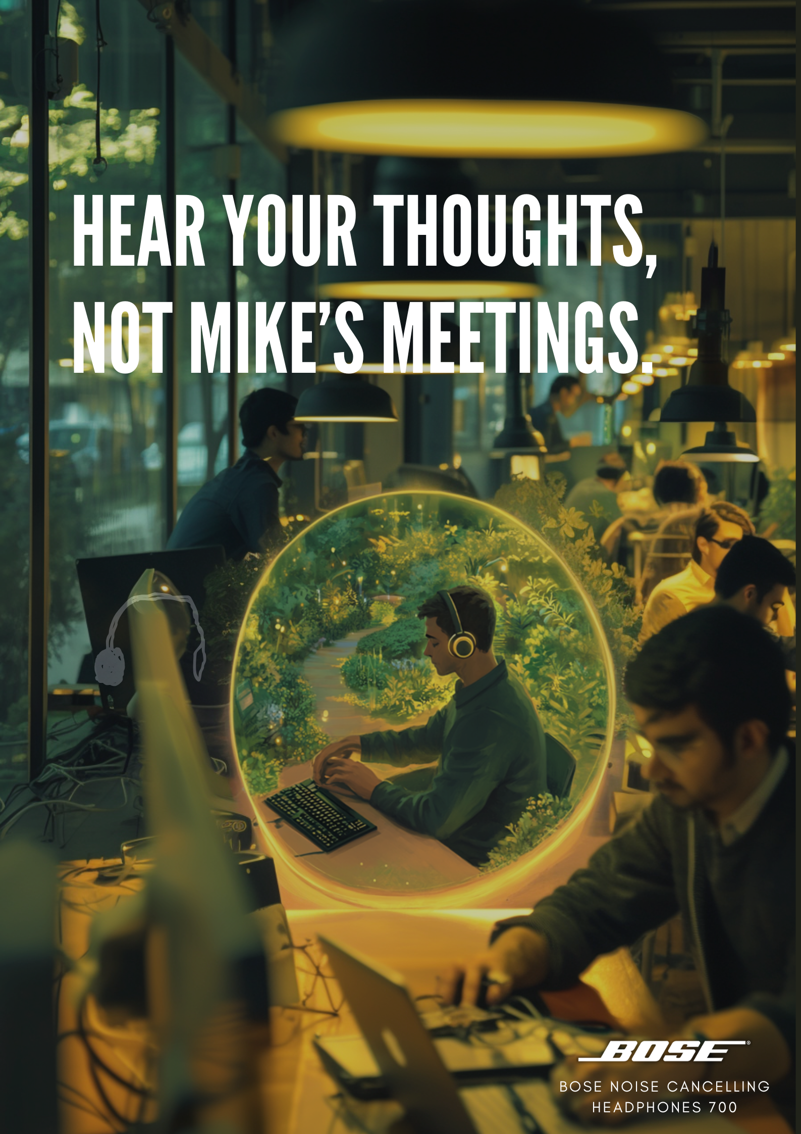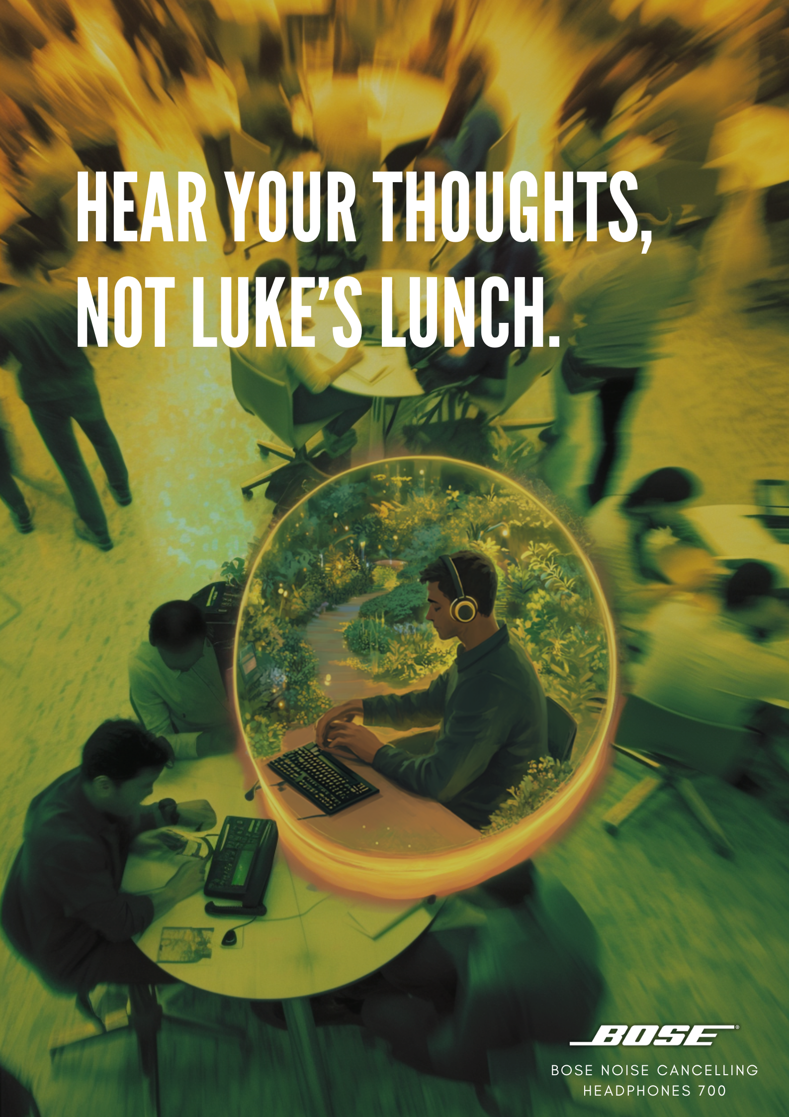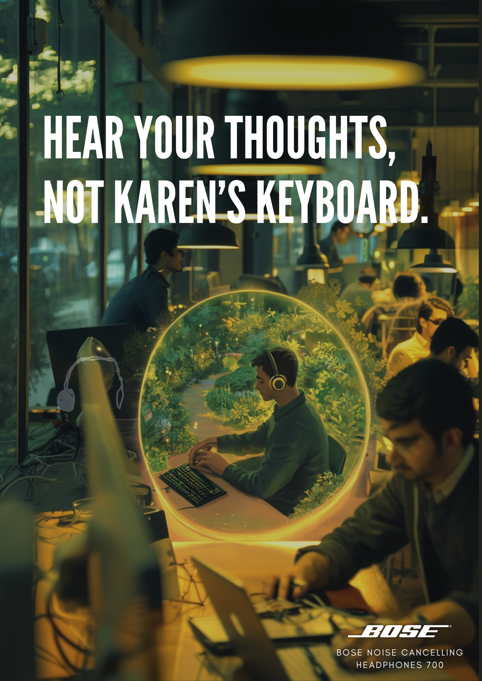 Print expanded the concept, building a relatable story about the chaos of open offices and how Bose cuts through it.